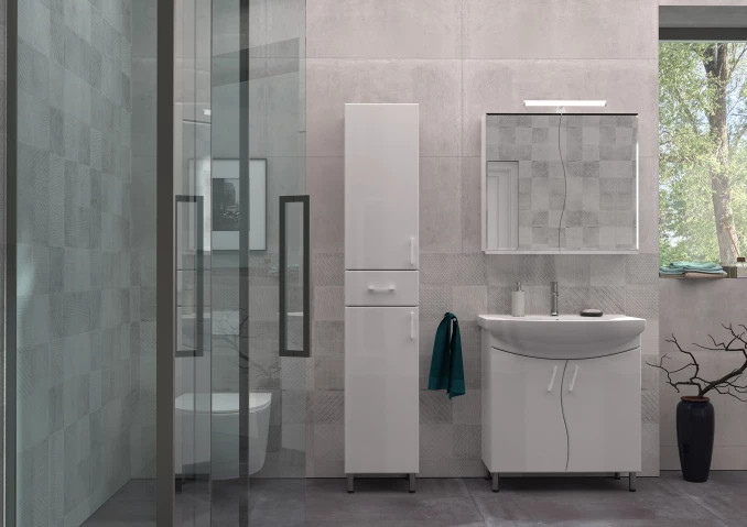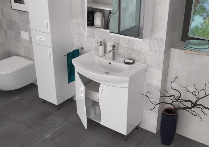 A PinoArt Siris 75S mosdós szekrény a stílusos tárolás és a modern kényelem ötvözete, amely ragyogó, magasfényű fehér felületével vizuálisan tágítja és tisztaságot visz a fürdőszobába. Ez a professzionális nedvességálló fürdőszoba bútor emelt minőségű alapanyagokból készül: a frontfelület lakkozott, emelt sűrűségű MDF-ből, a korpusz pedig speciálisan kezelt bútorlapból áll, így hosszú távon is ellenáll a párának és a ráfröccsenő víznek. A 750 mm széles kialakítás bőséges tárolóhelyet biztosít a piperecikkek számára, miközben a beépített soft-close (csillapított záródású) mechanika gondoskodik az ajtók halk és kíméletes csukódásáról. A bútor különlegessége az egyedi, hullámos vonalvezetésű ajtókialakítás, amely a stabil lábakon álló kivitellel együtt modern és esztétikus megjelenést kölcsönöz, miközben megkönnyíti a bútor alatti takarítást is.