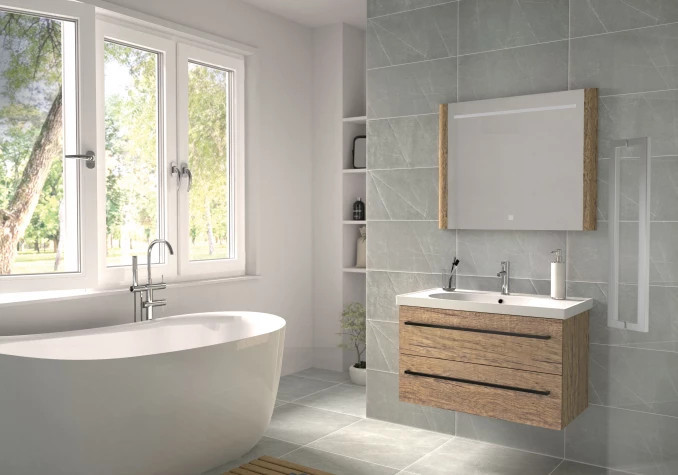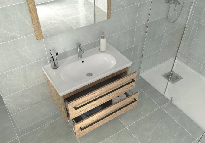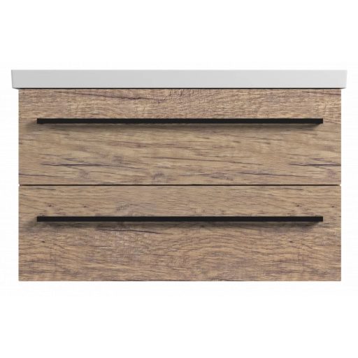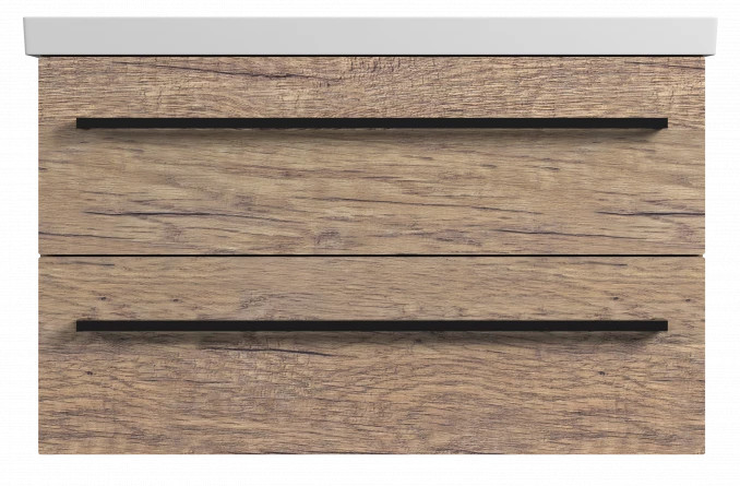 Vigyen markáns, indusztriális karaktert fürdőszobájába a LineART PLAZA függesztett szekrénnyel, amely a mélyen textúrált rusztikus antik tölgy felület és a matt fekete fogantyúk drámai kontrasztjával hódít. A bútor válogatott, prémium minőségű nedvességálló alapanyagokból készül, így a magas páratartalom ellenére is évtizedekig megőrzi vetemedésmentes szerkezetét és egyedi, fahatású esztétikáját. A szett részét képező, precízen illeszkedő fehér kerámia mosdó higiénikus, karcálló és rendkívül könnyen tisztítható felületet biztosít. A két tágas, csillapított záródású fiók bőséges tárolóhelyet kínál, miközben a függesztett kivitel tágítja a teret és megkönnyíti a padló tisztítását.