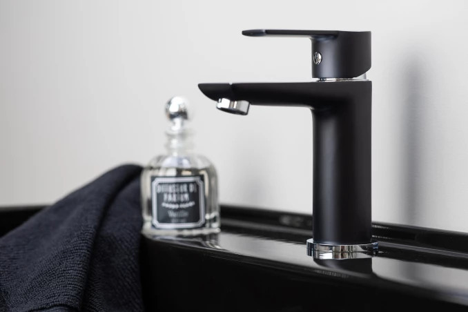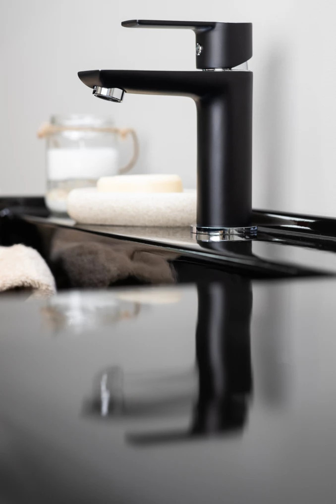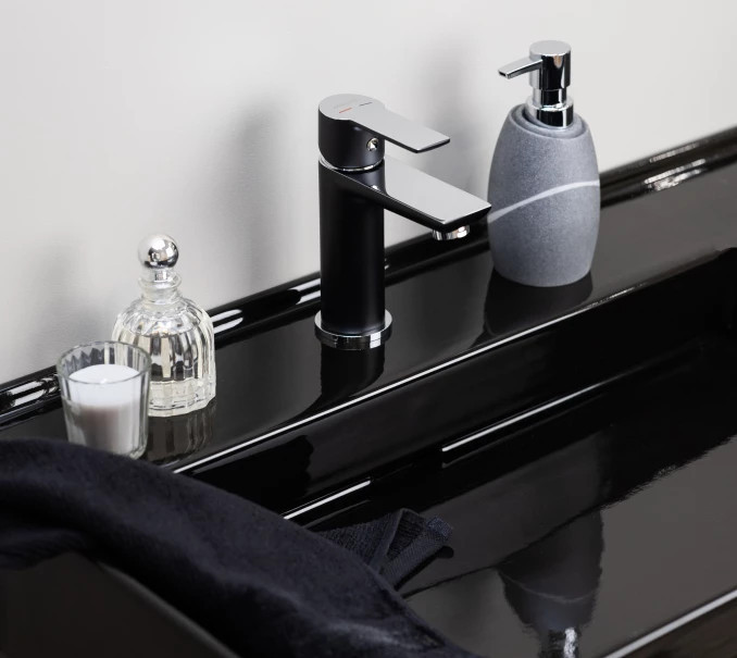 - Kontrasztos, Modern Design: A fekete és a króm felületek találkozása elegáns és dinamikus megjelenést kölcsönöz, amely tökéletesen illeszkedik a kortárs fürdőszobákba.