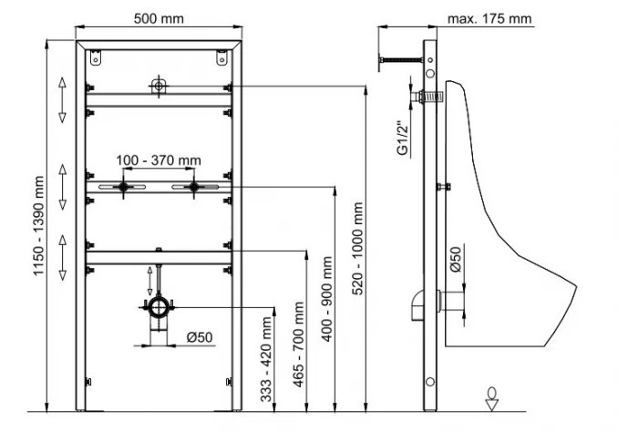 - Piszoár rögzítési távolság: 100–370 mm (univerzálisan állítható)