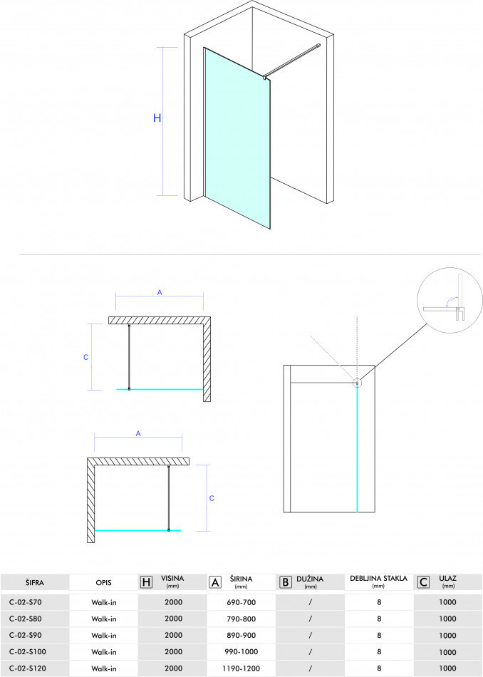COPEN MONTE Walk-in zuhanyfal 700x2000 mm, króm