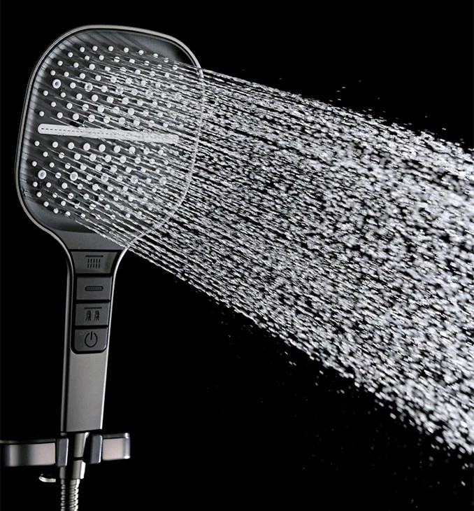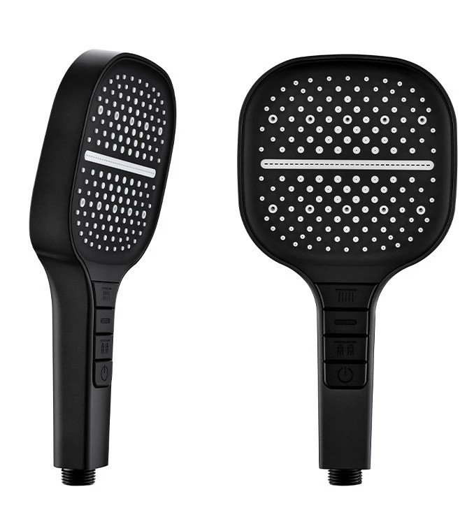 Teremtsen modern és karakteres hangulatot fürdőszobájában ezzel a prémium matt fekete kézi zuhanyfejjel. A minimalista, szögletesített formavilág és a nagyméretű, 130 mm-es fejrész lenyűgöző esztétikát és bőséges vízsugarat kínál, amely minden zuhanyzást felfrissítő élménnyé emel. A markolaton elhelyezett, intuitív nyomógombos vezérléssel könnyedén válthat a három funkció között, így a lágy esőztetéstől az intenzív vízsugárig mindent egyetlen gombnyomással elérhet. A magas minőségű ABS alapanyag és a vízkőmentes szilikon fúvókák garantálják a hosszú élettartamot és a könnyű tisztíthatóságot, miközben a matt fekete felület elegáns és ujjlenyomat-mentes megjelenést biztosít.