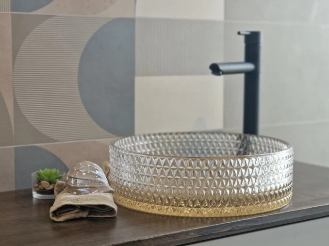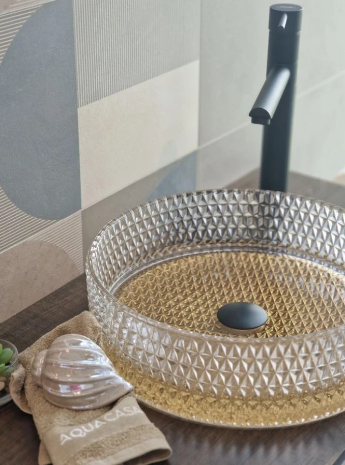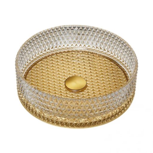 Varázsoljon luxus atmoszférát fürdőszobájába ezzel az exkluzív, kéttónusú COPEN üvegmosdóval. A szaniter különlegessége a kristálytiszta, áttetsző üvegfal és a ragyogó arany aljzat fúziója, amely mélységet és nemes eleganciát kölcsönöz a mosdózónának. A külső felületen végigfutó, precíz geometrikus textúra prizmaként töri meg a fényt, így az arany belső minden szögből más-más tónusban tündököl. A pultra helyezhető kialakítás kiemeli a mosdó ékszerszerű megjelenését, amely a modern glamúr és a minimál design tökéletes ötvözete. Válaszd ezt a modellt, ha egyedi, látványos és kompromisszumok nélküli prémium megoldást keresel otthonodba!