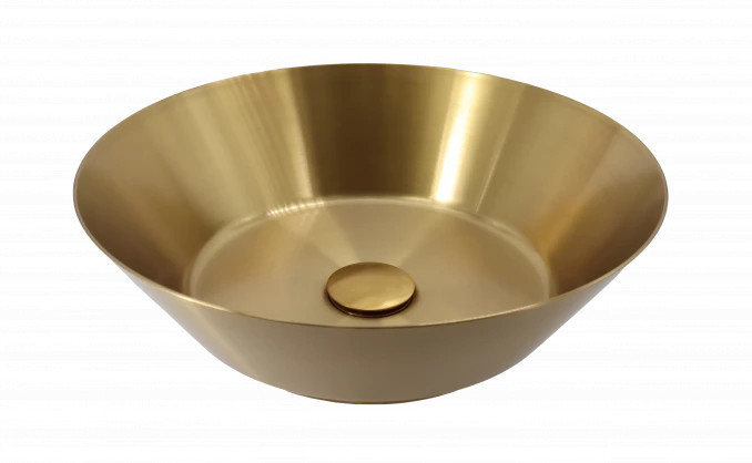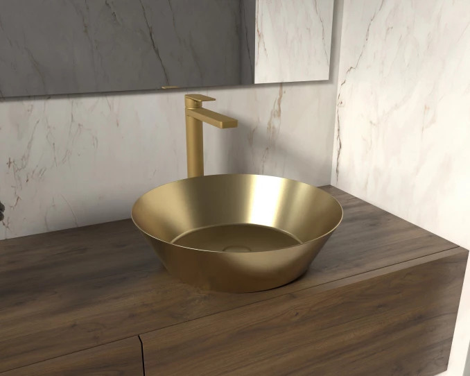 Vigyen extravagáns luxust és meleg ragyogást fürdőszobájába ezzel a különleges, szálcsiszolt arany felületű COPEN fém mosdóval. A nemesfém hatású, texturált felület és a tökéletes kör alakú forma az ékszerek finomságát ötvözi az indusztriális tartóssággal, így válik a helyiség legfőbb ékkövévé. Ez a kompakt, pultra helyezhető darab ideális választás azoknak, akik merész stílusnyilatkozattal és prémium minőségű alapanyagokkal szeretnék egyedivé varázsolni otthonuk belső terét.