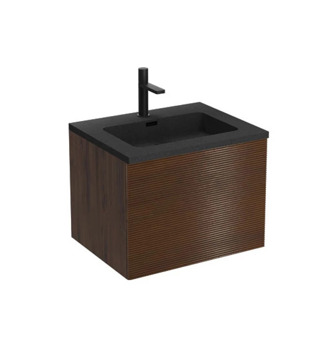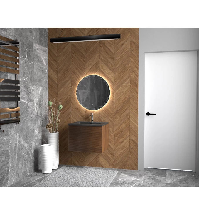 Vigyen drámai és exkluzív megjelenést fürdőszobájába a COPEN Lumber függesztett szekrénnyel, amely a mély tónusú füstölt sötét tölgy textúra és a matt fekete mosdó lenyűgöző kontrasztjára épít. A különleges, bordázott (3D) frontfelület nemcsak vizuális mélységet ad a bútornak, hanem egyedi tapintást és prémium karaktert kölcsönöz a térnek. A teljes szerkezet speciális, nagy sűrűségű nedvességálló alapanyagokból készül, így a párás környezet ellenére is évtizedekig garantált a vetemedésmentes használat. A két tágas, csillapított záródású fiók bőséges tárolóhelyet biztosít, miközben a függesztett kivitel tágítja a teret és megkönnyíti a padló tisztítását.