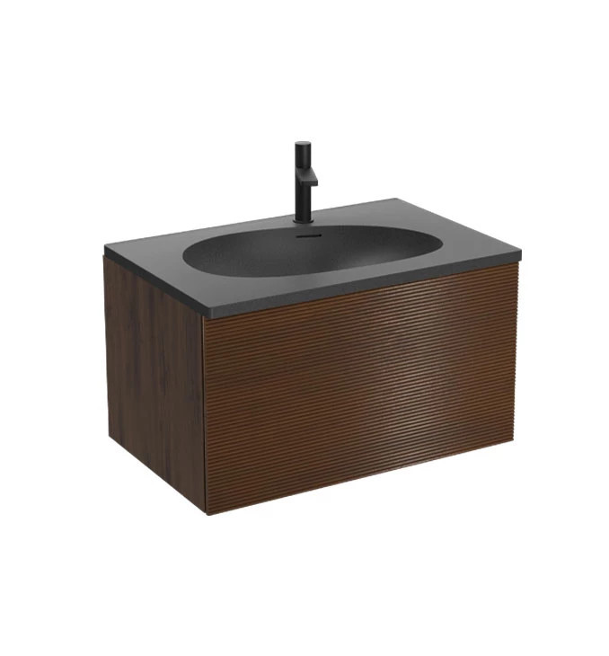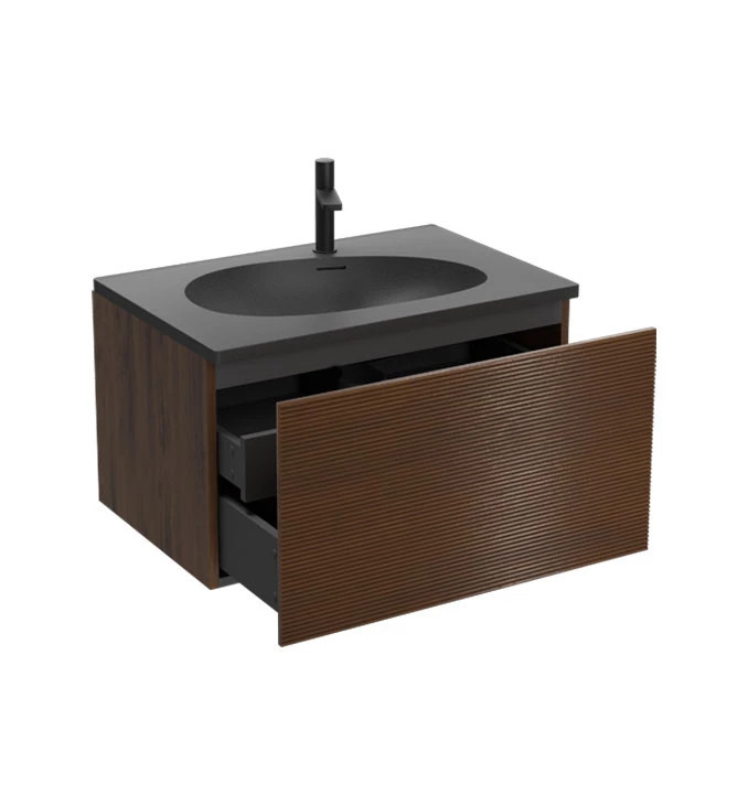 Teremtsen exkluzív, modern loft hangulatot fürdőszobájában a LineART Piedra függesztett szekrénnyel, amely a nemes sötét dió textúra és a karakteres matt fekete mosdó drámai találkozása. A bútor különlegessége a vízszintesen bordázott (3D) frontfelület, amely vizuális mélységet és egyedi, prémium karaktert kölcsönöz a térnek. A teljes szerkezet speciális, nagy sűrűségű nedvességálló alapanyagokból készül, így a párás környezet ellenére is évtizedekig garantált a vetemedésmentes használat és a makulátlan esztétika. A tágas, csillapított záródású fiók bőséges helyet biztosít, miközben a függesztett kivitel tágítja a teret és megkönnyíti a padló tisztítását.