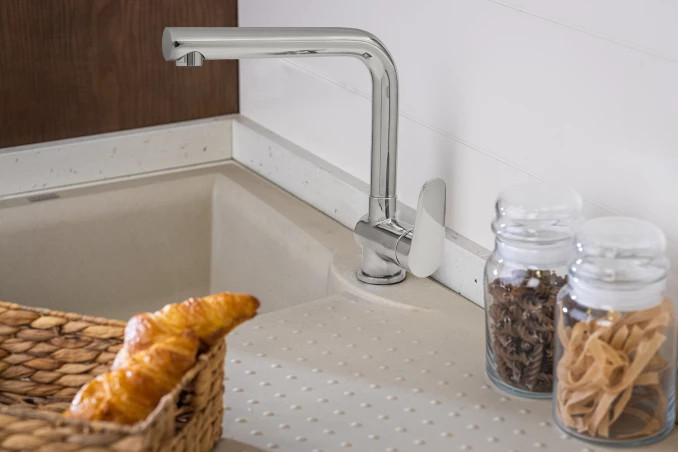 Vigyen letisztult, kortárs eleganciát konyhájába az olasz Emmevi Beta New mosogató csapteleppel, amely a minimál dizájn és a funkcionális precizitás mesteri ötvözete. A 90 fokban megtört, modern hattyúnyakú kialakítás nem csupán esztétikai élményt nyújt, hanem kiemelkedő magasságával bőséges teret biztosít a nagyméretű edények kényelmes megtöltéséhez és tisztításához. A ragyogó króm felület és a prémium olasz mérnöki munka garantálja a hosszú élettartamot, miközben selymesen sima kezelhetőséget kínál a mindennapi használat során. Ez a professzionális szaniter a stílus és a tartósság ideális egyensúlyát képviseli bármely igényes konyhai környezetben.