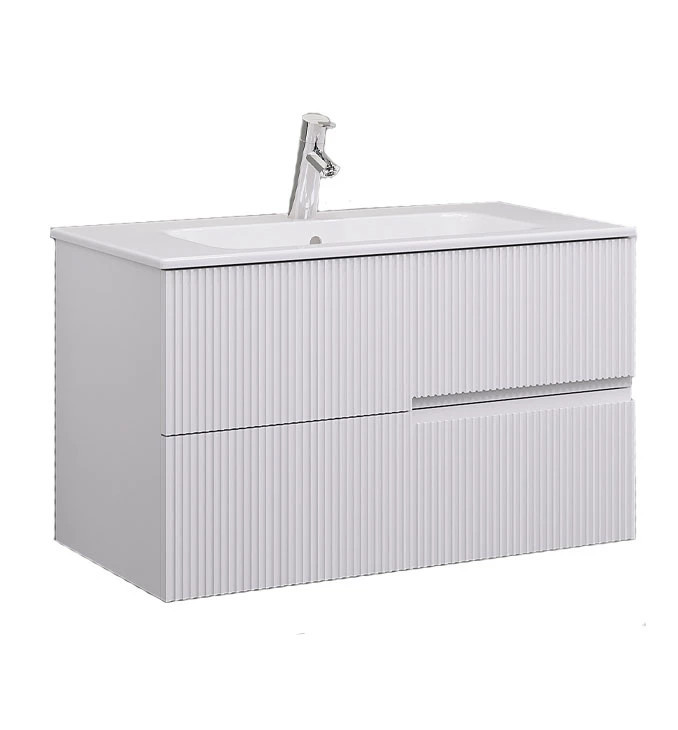 Emelje fürdőszobája fényét a LineART DROP függesztett szekrénnyel, amely a modern matt fehér felület és a különleges bordázott (ripad) front elegáns találkozása. A bútor válogatott, prémium minőségű nedvességálló alapanyagokból készül, így a párás környezet ellenére is évtizedekig megőrzi selymes tapintású, ujjlenyomatmentes felületét és szerkezeti stabilitását. A két tágas, rejtett fogantyús fiók bőséges tárolóhelyet biztosít, miközben a függesztett kivitel tágítja a teret és megkönnyíti a padló tisztítását. Fontos: A termék a képen látható mosdókagylót és csaptelepet nem tartalmazza, így Ön teljesen egyedi igényei szerint választhat hozzá egy stílusos pultra helyezhető vagy beépíthető megoldást.