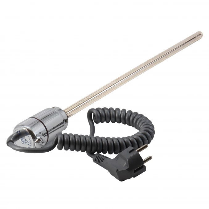 A magasfényű króm felület esztétikusan illeszkedik a modern radiátorokhoz, míg a spirál kialakítású kábel praktikus és rendezett megoldást kínál, mivel rugalmasan alkalmazkodik a csatlakozóaljzat távolságához, és használat közben sem lóg zavaróan.