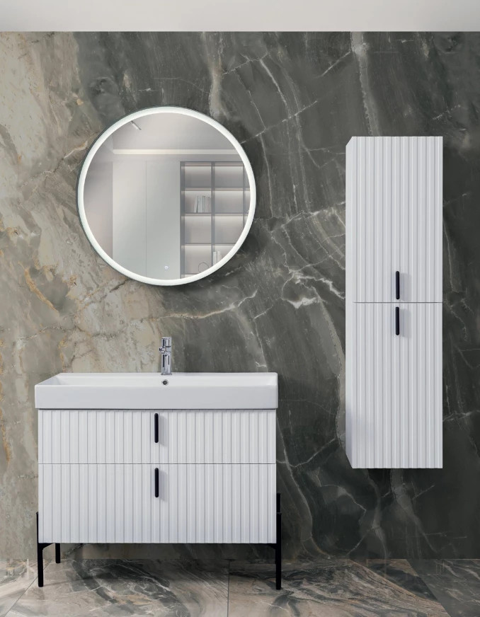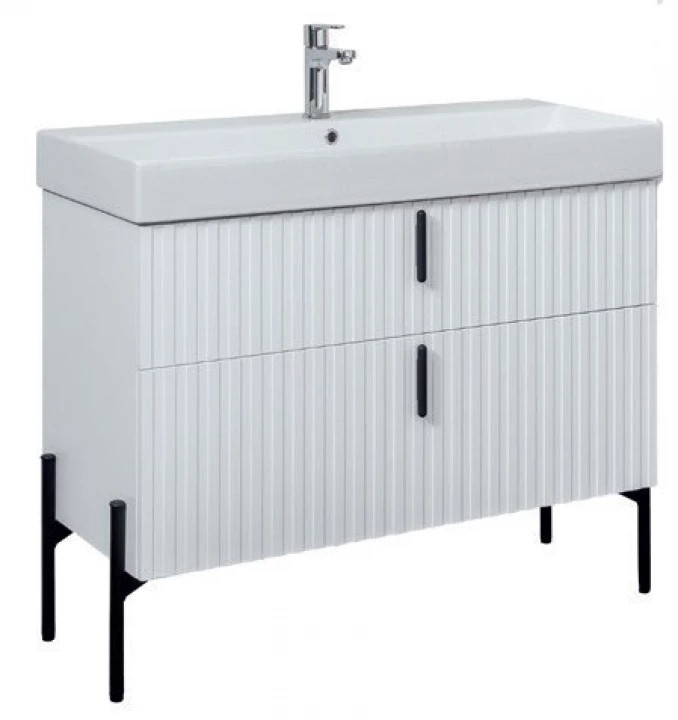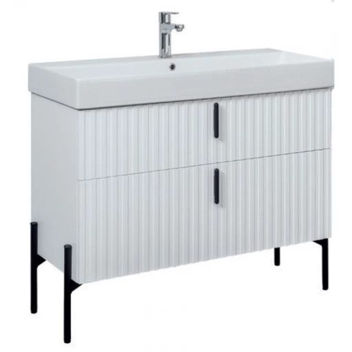Vigyen modern eleganciát és texturált mélységet fürdőszobájába a LineART Jazz álló mosdószekrénnyel, amely a selymes matt fehér felület és a különleges bordázott (Jazz) front harmóniájával hódít. A bútor válogatott, prémium minőségű nedvességálló alapanyagokból készül, így a magas páratartalom ellenére is évtizedekig megőrzi makulátlan esztétikáját és szerkezeti stabilitását. A szett részét képező, precízen illeszkedő kerámia mosdó higiénikus, karcálló és rendkívül könnyen tisztán tartható. A filigrán matt fekete lábakon álló kivitel légies megjelenést kölcsönöz, miközben a két tágas fiók bőséges tárolóhelyet biztosít a mindennapi kiegészítőknek.