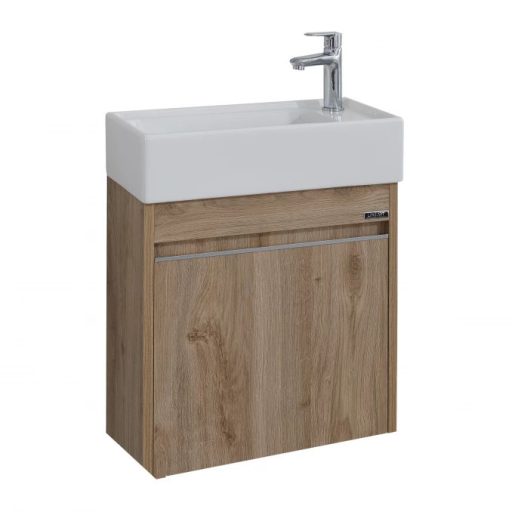 Vigyen természetes melegséget és modern eleganciát fürdőszobájába a LineART Moon függesztett szekrénnyel, amely a népszerű natúr tölgy textúra és a letisztult vonalvezetés harmóniájával hódít. A bútor válogatott, prémium minőségű nedvességálló alapanyagokból készül, így a párás környezet ellenére is évtizedekig megőrzi vetemedésmentes szerkezetét és karakteres fa esztétikáját. A szett részét képező, precízen illeszkedő kerámia mosdó higiénikus, karcálló és rendkívül könnyen tisztítható felületet biztosít a mindennapi használathoz. A függesztett kivitel tágítja a teret, a kompakt 50 cm-es szélesség pedig ideális választás kisebb fürdőszobákba vagy vendég-WC-kbe is.