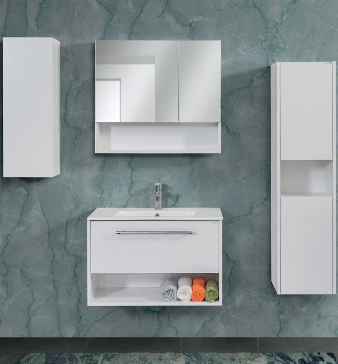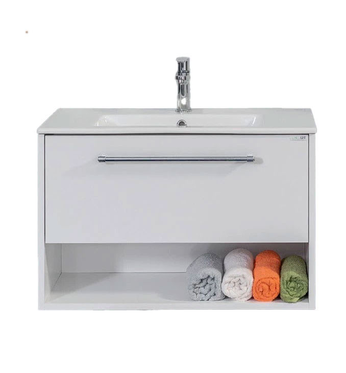 A LineART NOVA 800 (NOV0800W-BS) mosdós alsószekrény a minimalista dizájn és a kompromisszummentes minőség találkozása. Ez a fényes fehér kivitel optikailag tágítja a teret és tiszta, modern atmoszférát teremt a fürdőszobában. A bútor prémium minőségű, vákuumpréselt MDF-ből készült, amelynek speciális High Gloss (magasfényű) felülete nemcsak esztétikus, hanem kiemelten nedvességálló is, így hosszú évekig ellenáll a párának és a közvetlen vízhatásoknak. A fali, függesztett kivitel és a Soft Close (csillapított) fiókrendszer garantálja a halk és biztonságos használatot. A szekrényhez egy pontosan illeszkedő, minőségi fehér kerámia mosdó tartozik. A hibátlan beépítés érdekében kérjük, vegye figyelembe a műszaki rajz milliméteres adatait és az ajánlott 85 cm-es beépítési magasságot.