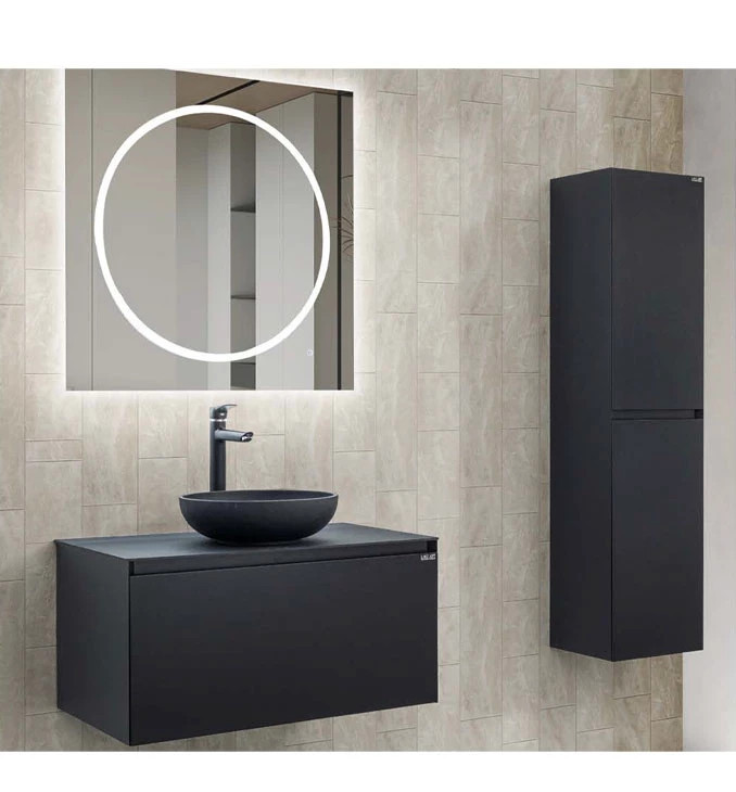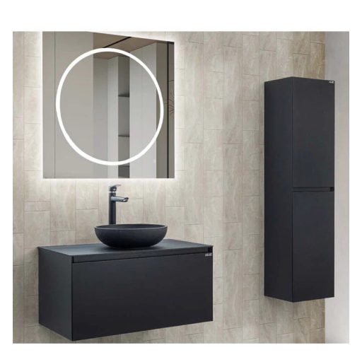 A LineART TISA mosdószekrény a karakteres, modern elegancia és a funkcionális tárolás tökéletes ötvözete, amely ujjlenyomatmentes matt fekete felületével a sötét tónusú luxus érzetét hozza el otthonába. A bútor válogatott, prémium minőségű nedvességálló alapanyagokból készül, így a párás környezet ellenére is évtizedekig megőrzi selymes tapintású felületét és szerkezeti stabilitását. A szekrényhez tartozó strapabíró fekete pultfelület ideális alapot nyújt bármilyen stílusos pultra helyezhető mosdónak, miközben a tágas, csillapított záródású fiók bőséges helyet biztosít a piperecikkeknek. Fontos: A termék a képen látható mosdókagylót nem tartalmazza, így Ön teljesen egyedi igényei szerint választhat hozzá illő medencét.