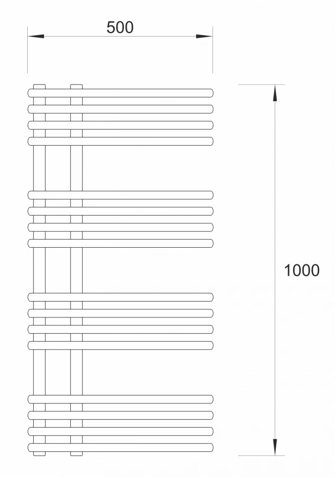 Törölközőszárítós radiátor 500x1000 mm méretben, matt fekete kivitelben, amely egyedi, aszimmetrikus kialakításával különleges megjelenést és kiemelkedő funkcionalitást kínál a fürdőszobában. A nyitott oldalsó profilok lehetővé teszik, hogy a törölközők oldalról, egyetlen mozdulattal felhelyezhetők legyenek, így a mindennapi használat gyorsabb és kényelmesebb.