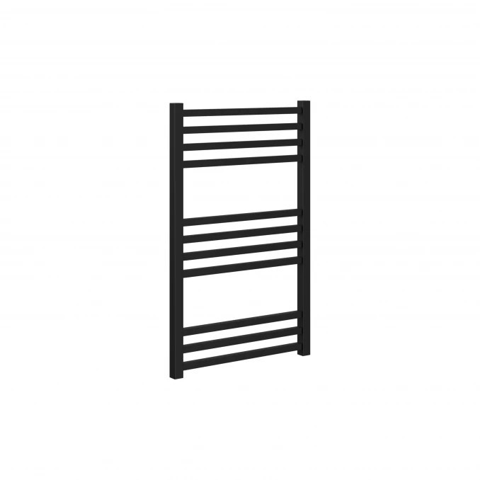 Törölközőszárítós radiátor 500x800 mm méretben, matt fekete kivitelben, amely modern és karakteres megjelenést visz a fürdőszobába. A WARME SAAR modell eltér a hagyományos létra radiátoroktól: sík, szögletes keresztcsövei egyedi design megjelenést biztosítanak, miközben nagyobb felületen érintkeznek a textíliákkal, így hatékonyabb száradást tesznek lehetővé.