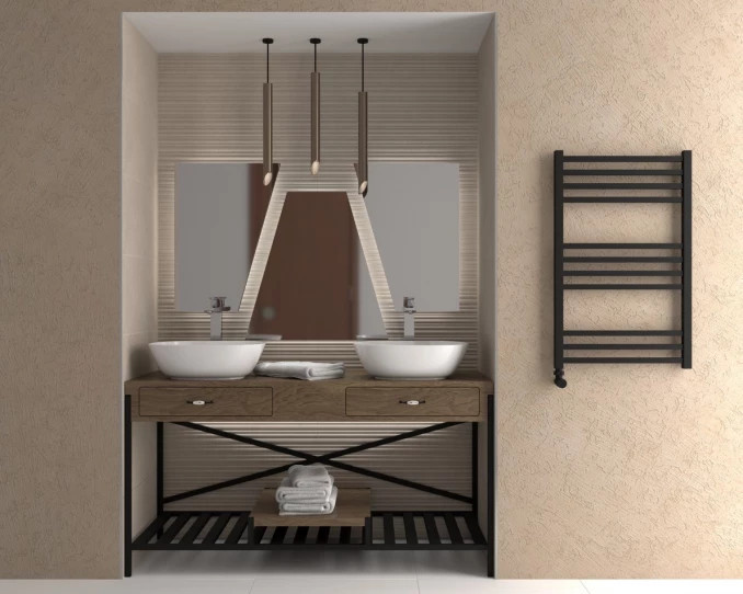 A kompakt méret ideális közepes fürdőszobákba, miközben a magas hőteljesítmény gondoskodik a helyiség kellemes melegéről és a törölközők gyors száradásáról. A matt fekete felület letisztult és prémium hatást kelt, tökéletesen illeszkedik a modern, minimál vagy indusztriális enteriőrökbe.