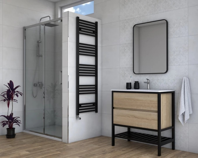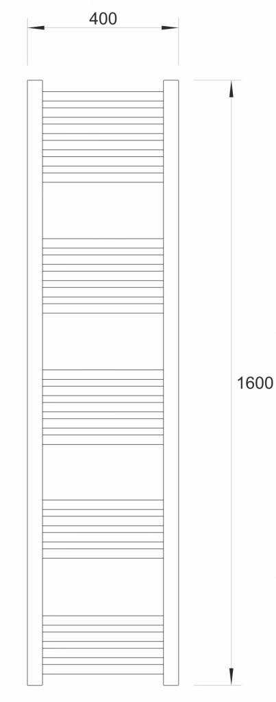 Törölközőszárítós radiátor 400x1600 mm méretben, elegáns matt fekete kivitelben, amely modern megjelenésével és hatékony hőleadásával ideális választás fürdőszobába. A 1600 mm-es magasság nagy szárítófelületet biztosít, így több törölköző egyidejű elhelyezésére is alkalmas.
